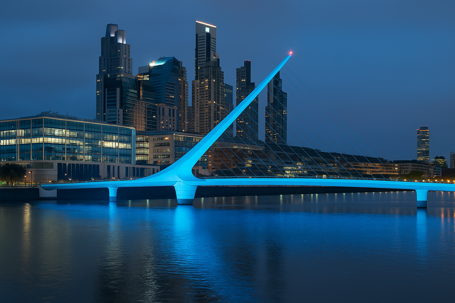 Puente de la Mujer iluminado de azul durante la noche, con los edificios de Puerto Madero al fondo reflejados en el agua.