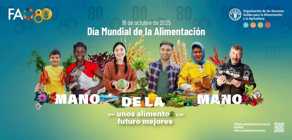 | Acerca de la FAO La Organización de las Naciones Unidas para la Alimentación y la Agricultura (FAO) es la agencia líder de la ONU en la lucha contra el hambre y la malnutrición, y en la promoción de la agricultura sostenible. Desde 1945 acompaña a los países en el diseño de políticas públicas, la innovación, la cooperación técnica y el fortalecimiento de capacidades para lograr sistemas agroalimentarios más justos, inclusivos y resilientes. Más información: www.fao.org/world-food-day/80th-anniversary/es Redes sociales: #DíaMundialDeLaAlimentación | #FAO80 |