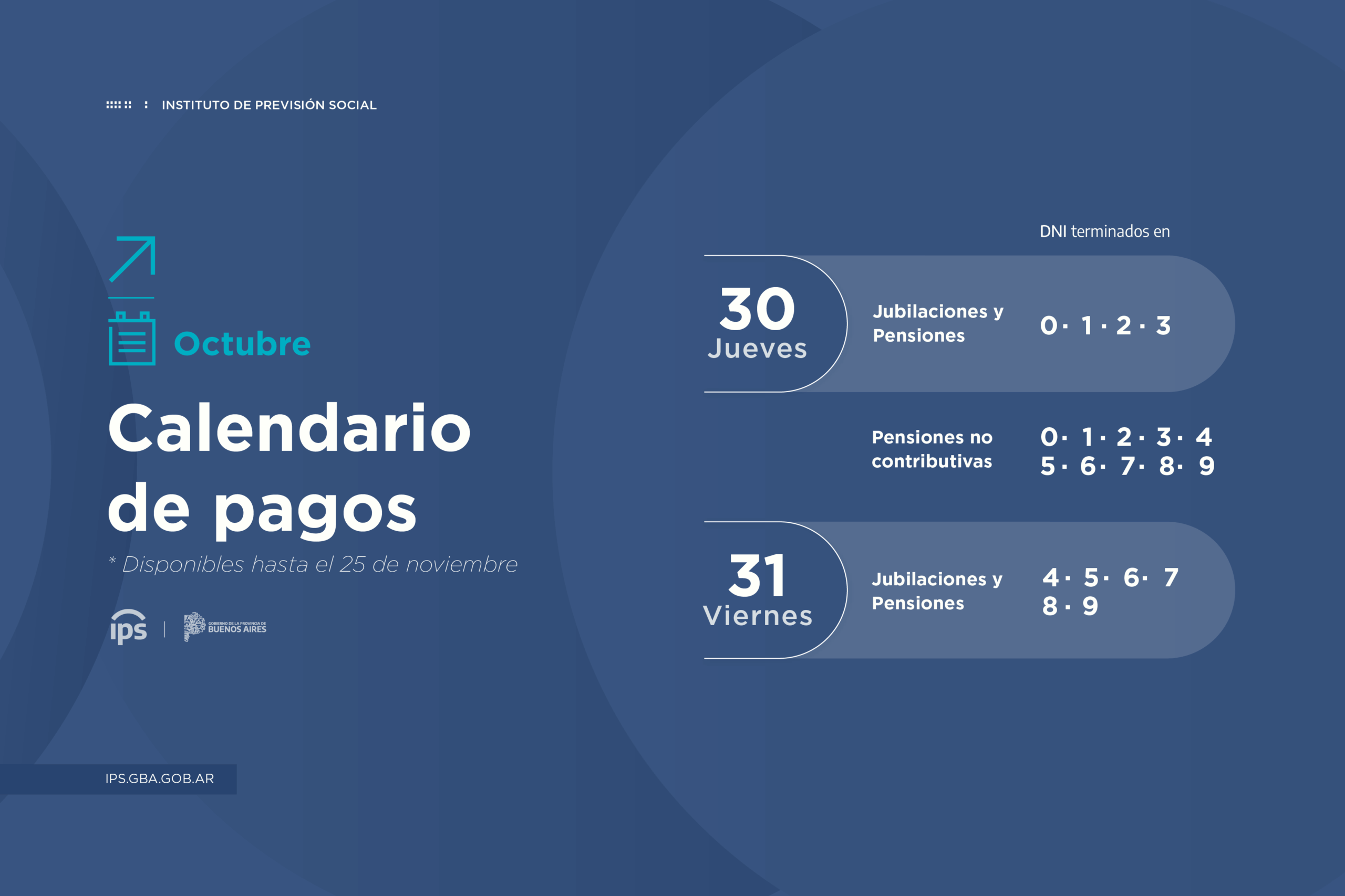 El Instituto de Previsión Social (IPS) informa que las personas jubiladas y pensionadas de la provincia de Buenos Aires percibirán los haberes del mes de octubre a partir del día jueves 30 del corriente, según cronograma que se detalla a continuación:
