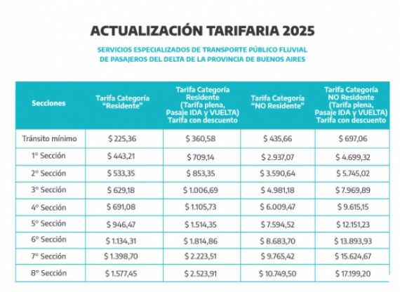 El Ministerio de Transporte de la Provincia de Buenos Aires pone en conocimiento público los cuadros tarifarios actualizados del transporte público fluvial de pasajeros del Delta bonaerense.