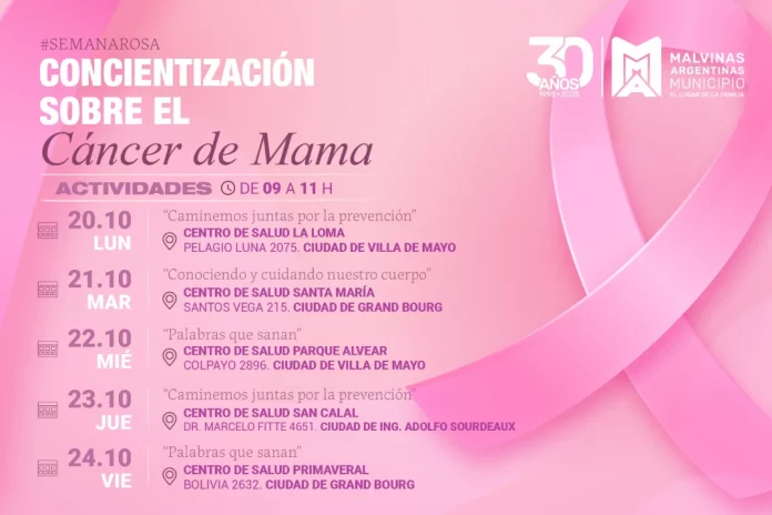 Octubre es el mes internacional de la concientización sobre el cáncer de mama. En este contexto, y durante la Semana Rosa del 20 al 24 de octubre, el municipio de Malvinas Argentinas acompañará a las mujeres del distrito con propuestas de prevención, información y encuentro, organizadas por la Secretaría de Salud.