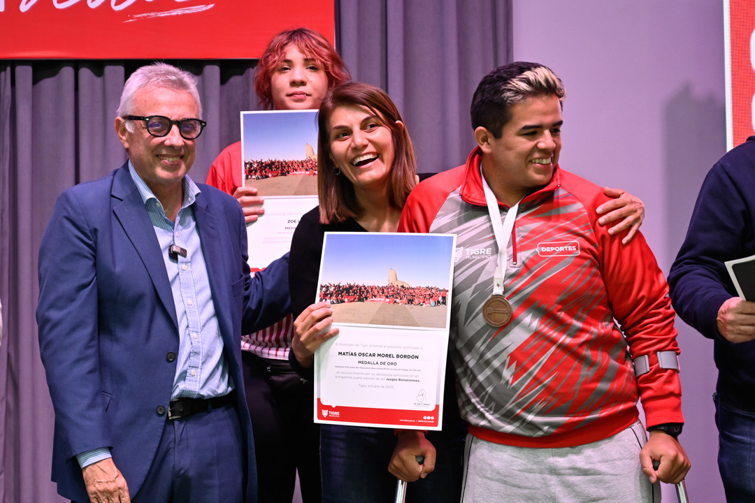 El Municipio de Tigre reconoció a vecinos y vecinas que compitieron en las finales de los Juegos Bonaerenses 2025, celebrados en la ciudad de Mar del Plata. El intendente Julio Zamora y la secretaría de Desarrollo Social y Políticas de Inclusión, Gisela Zamora, acompañaron la jornada llevada adelante en el SUM del Honorable Concejo Deliberante (HCD).