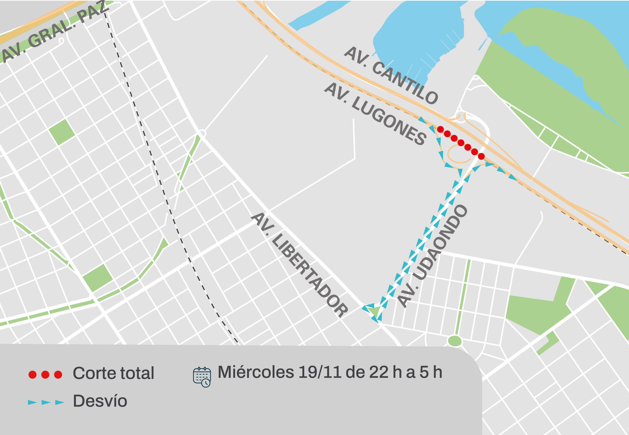 El miércoles 19 de noviembre de 22 a 5 am, se llevará adelante un corte parcial en Avenida Lugones, mano a capital. Se realiza el desvío por la salida hacia Avenida Udaondo. Los vehículos de tránsito pesado deberán circular por Avenida Libertador, hasta Udaondo, para poder volver a circular por Avenida Lugones.