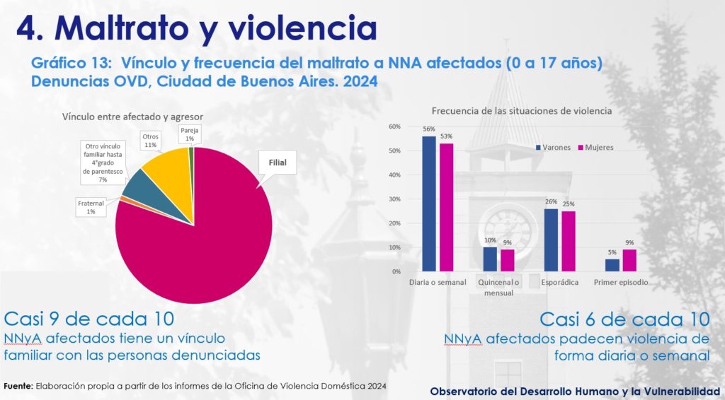 La evidencia más reciente confirma que la violencia contra la infancia sigue siendo un problema estructural. Según datos de la Oficina de Violencia Doméstica (OVD), en 2024 los niños, niñas y adolescentes representaron el 30 % de los afectados en casos de violencia doméstica, con una tendencia creciente en los últimos años. Casi 9 de cada 10 víctimas tenía vínculo familiar con el agresor y 6 de cada 10 padecía violencia diaria o semanal. Las formas más frecuentes fueron la violencia psicológica (más del 90 %) y la física (entre el 34 % y el 39 %), seguidas por violencia simbólica, económica y sexual. El grupo más afectado fue el de 6 a 10 años, mientras que entre los adolescentes de 15 a 17 años se registró el 28 % de las lesiones físicas constatadas.