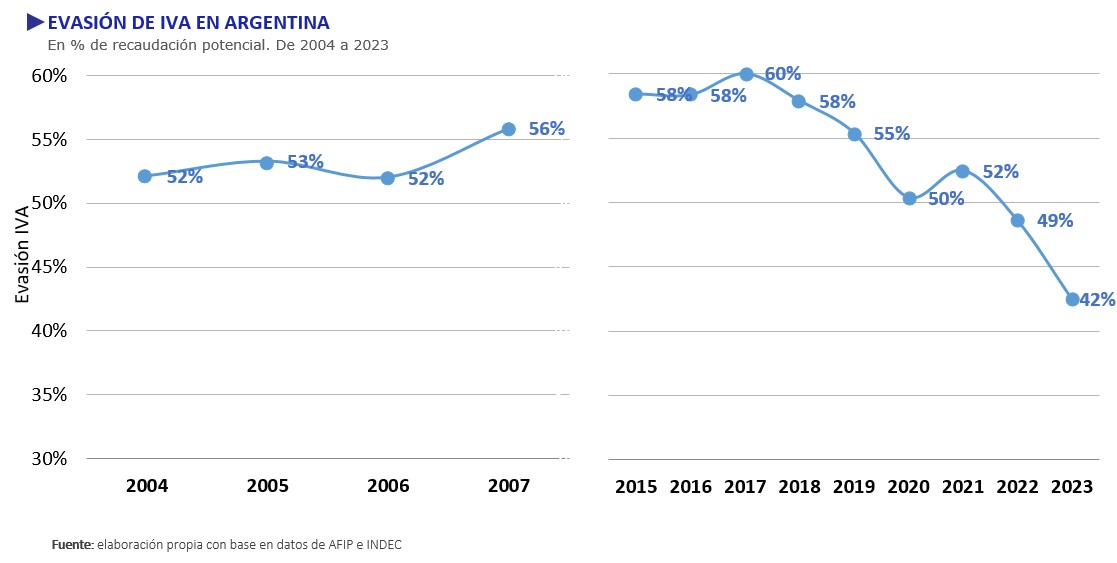 En el informe anterior —publicado en diciembre de 2024 con datos correspondientes a 2022— el CET había señalado una primera reducción significativa de la evasión. En 2021, la evasión de IVA alcanzaba el 52%, mientras que en 2022 bajó al 49%, valor que entonces se consideró el más bajo de la serie. Esa caída estaba explicada, en parte, por la diferencia entre la evolución de la recaudación y la actividad gravada: mientras esta última creció un 74%, la recaudación lo hizo en un 88%. También había contribuido la moratoria prevista en la Ley de Alivio Fiscal (27.653/2021), implementada como parte de las medidas de recuperación económica pospandemia.
