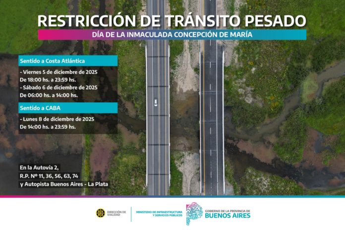 La Dirección de Vialidad de la Provincia de Buenos Aires, dependiente del Ministerio de Infraestructura y Servicios Públicos, comunica que -debido al Día de la Día de la Inmaculada Concepción de María – los días viernes 5, sábado 6 y lunes 8 de diciembre de 2025 se restringirá la circulación de camiones con carga de más de 7 (siete) toneladas de porte bruto en la Autovía 2, las Rutas Provinciales Nº11, Nº36, Nº56, Nº63, Nº74, y la Autopista Buenos Aires–La Plata, con el objetivo de facilitar el desplazamiento vehicular y prevenir siniestros de tránsito en rutas turísticas.