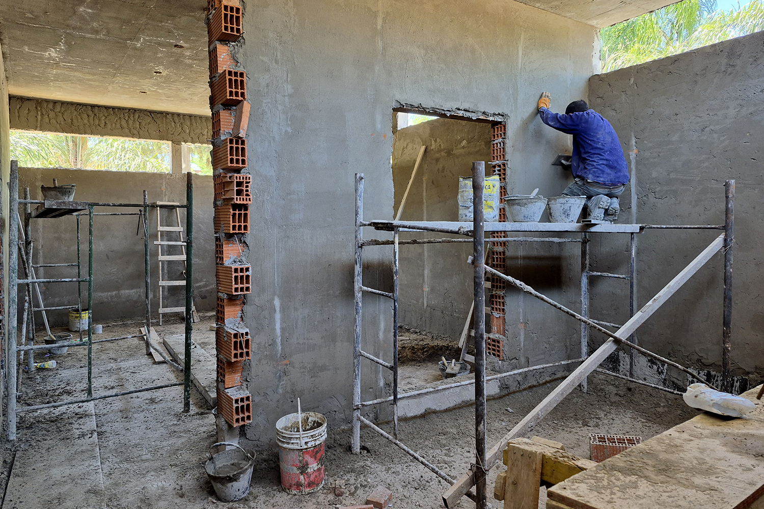 Actualmente se están realizando revoques en las mamposterías interiores y movimiento de suelo para la construcción de la rampa, escalera y gradas en el lugar. Esta obra duplicará la capacidad actual que tienen los vestuarios ya existentes.