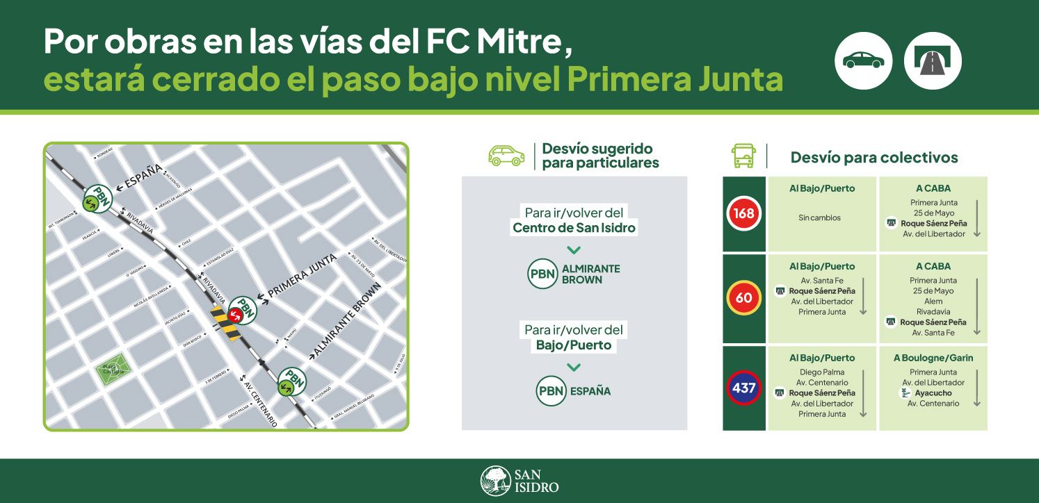 En este marco, desde el Municipio de San Isidro se recomiendan las siguientes alternativas para vehículos particulares: el Paso bajo nivel Almirante Brown (para ir y volver del Centro de San Isidro) y el Paso bajo nivel España (para ir y volver del Bajo/Puerto de San Isidro).