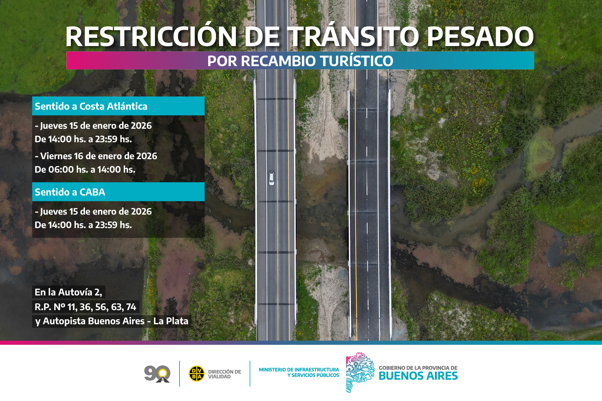 La Dirección de Vialidad de la Provincia de Buenos Aires, dependiente del Ministerio de Infraestructura y Servicios Públicos, comunica que -debido al recambio turístico – los días jueves 15 y viernes 16- se restringirá la circulación de camiones con carga de más de 7 (siete) toneladas de porte bruto en la Autovía 2, las Rutas Provinciales Nº11, Nº36, Nº56, Nº63, Nº74, y la Autopista Buenos Aires–La Plata, con el objetivo de facilitar el desplazamiento vehicular y prevenir siniestros de tránsito en rutas turísticas.