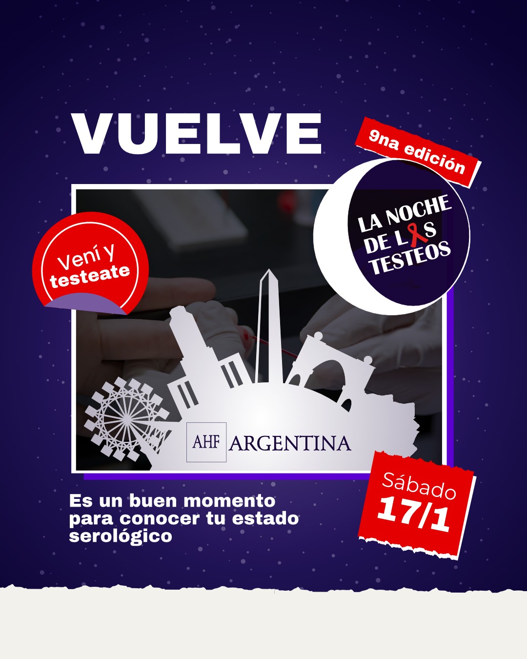El sábado 17 de enero se llevará a cabo la 9° edición de La Noche de los Testeos, la jornada de prevención y diagnóstico que AHF Argentina (AIDS Healthcare Foundation) impulsa junto a organizaciones aliadas. Como parte de esta iniciativa, se realizarán actividades en diferentes puntos del país, con testeos rápidos de VIH, puestos de consulta e información y entrega de preservativos de su marca propia, Love.