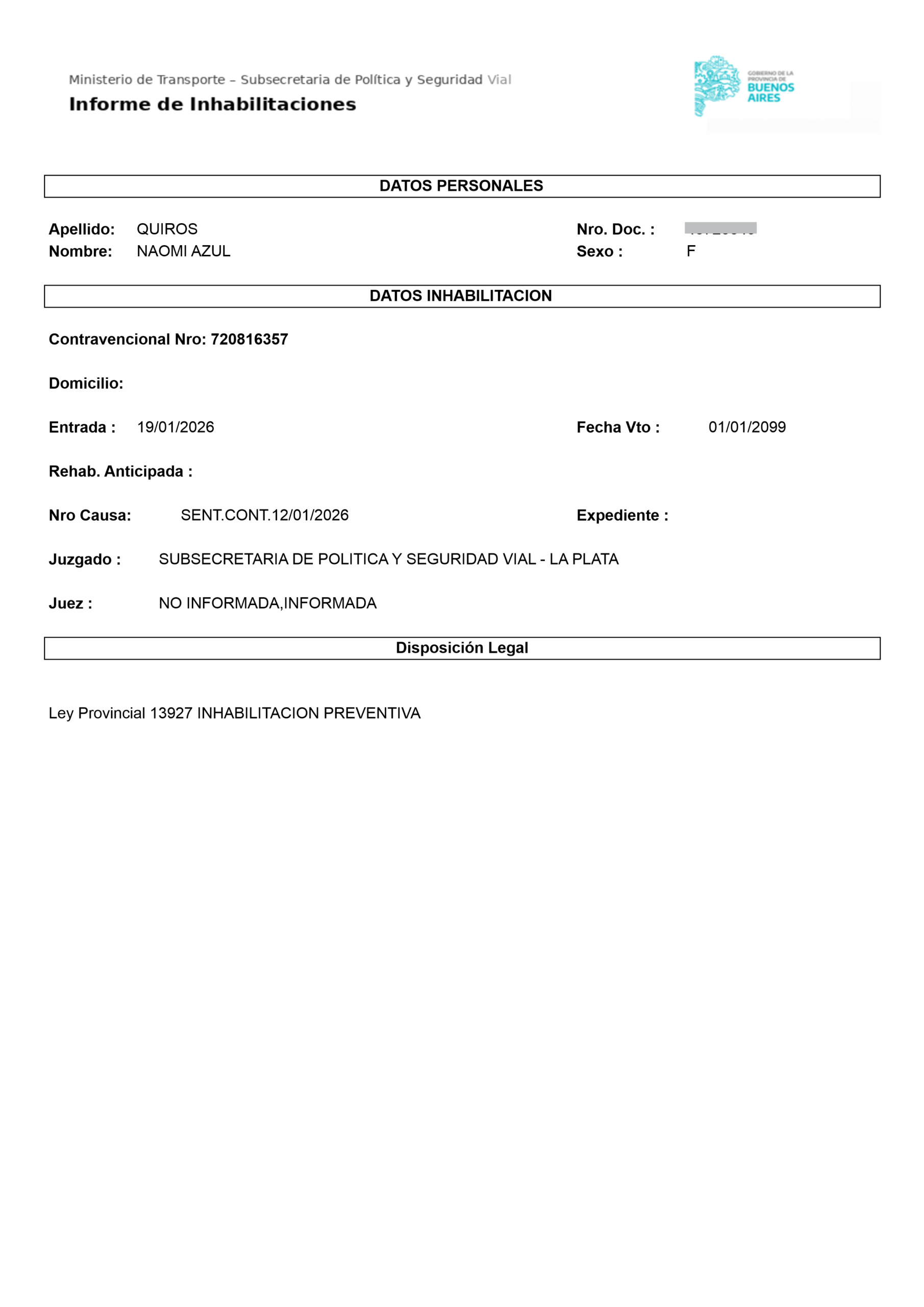 La conductora del UTV en el que circulaba Bastián y el conductor de la camioneta Volkswagen Amarok que impactó contra el vehículo utilitario fueron inhabilitados por el Ministerio de Transporte, que conduce Martín Marinucci, tras la intervención inicial de la Justicia por la gravedad de los hechos ocurridos en la zona de La Frontera. Se trata de Noemí Quirós y Manuel Molinari, respectivamente, quienes fueron sancionados por la Subsecretaría de Políticas de Seguridad Vial.