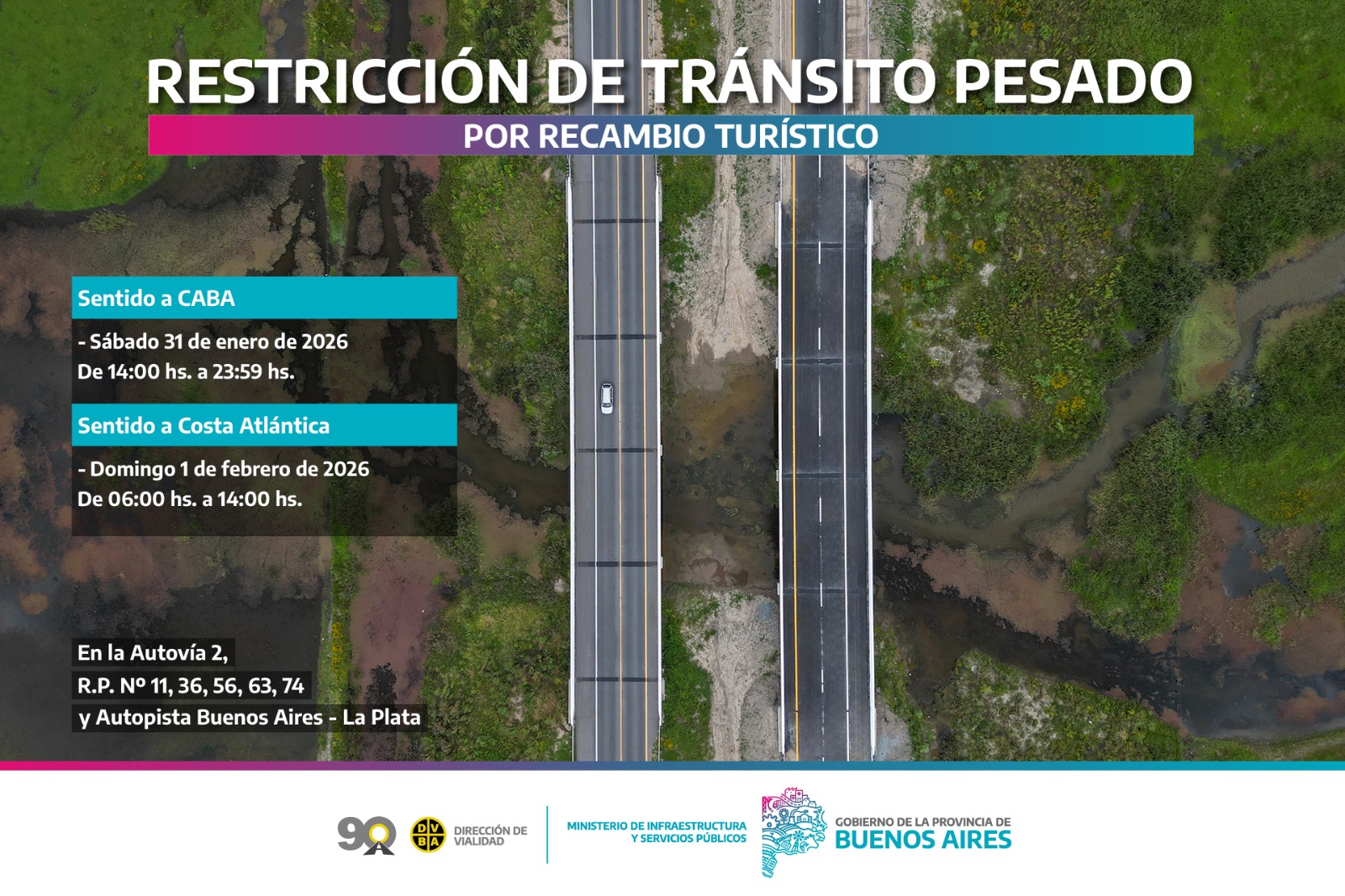 La Dirección de Vialidad de la Provincia de Buenos Aires, dependiente del Ministerio de Infraestructura y Servicios Públicos, comunica que -debido al recambio turístico – los días sábado 31 de enero y domingo 1 de febrero- se restringirá la circulación de camiones con carga de más de 7 (siete) toneladas de porte bruto en la Autovía 2, las Rutas Provinciales Nº11, Nº36, Nº56, Nº63, Nº74, y la Autopista Buenos Aires–La Plata, con el objetivo de facilitar el desplazamiento vehicular y prevenir siniestros de tránsito en rutas turísticas.