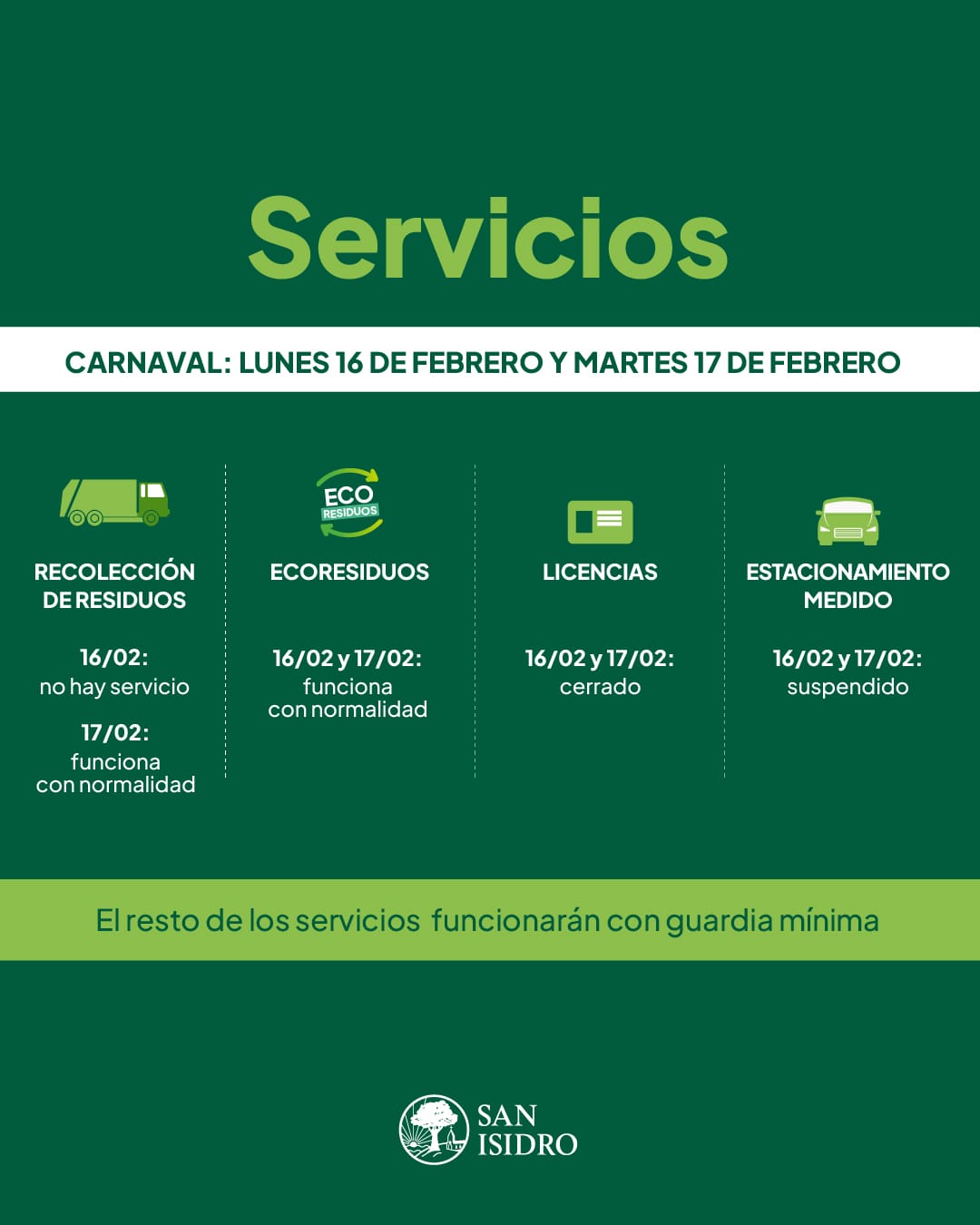 El Municipio de San Isidro informa cómo funcionarán los servicios municipales este lunes 16 y martes 17 de febrero. Además, los vecinos podrán disfrutar de la agenda de verano, con una amplia variedad de actividades para todas las edades, gratuitas y al aire libre.