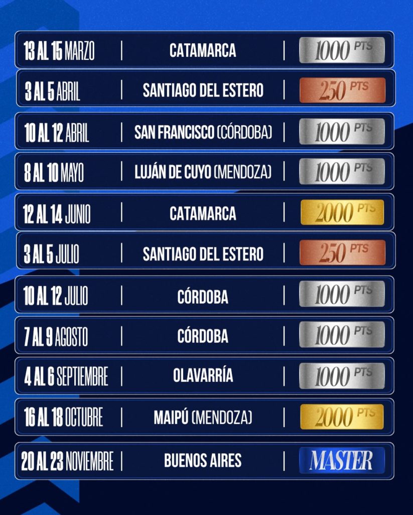 El circuito contará con ocho fechas y un Master Final, incorporando torneos de 1000 y 2000 puntos, un ranking anual que premia la regularidad y un calendario federal que recorrerá distintas provincias del país.