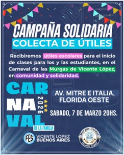 Entendiendo que el encuentro en comunidad debe fortalecer los lazos de apoyo mutuo, esta edición del carnaval integra una importante Campaña Solidaria de Recolección de Útiles Escolares organizada por la Federación de Estudiantes Secundarios (FES) de Vicente López. La intención es acompañar a las familias del distrito en el inicio del ciclo lectivo 2026, por lo que se dispondrá una posta de recepción de donaciones a partir de las 20:00 horas en el punto ubicado en Av. Mitre e Italia. https://www.instagram.com/p/DVePHliEpPF/?igsh=OGF5enlneWp3OXE5