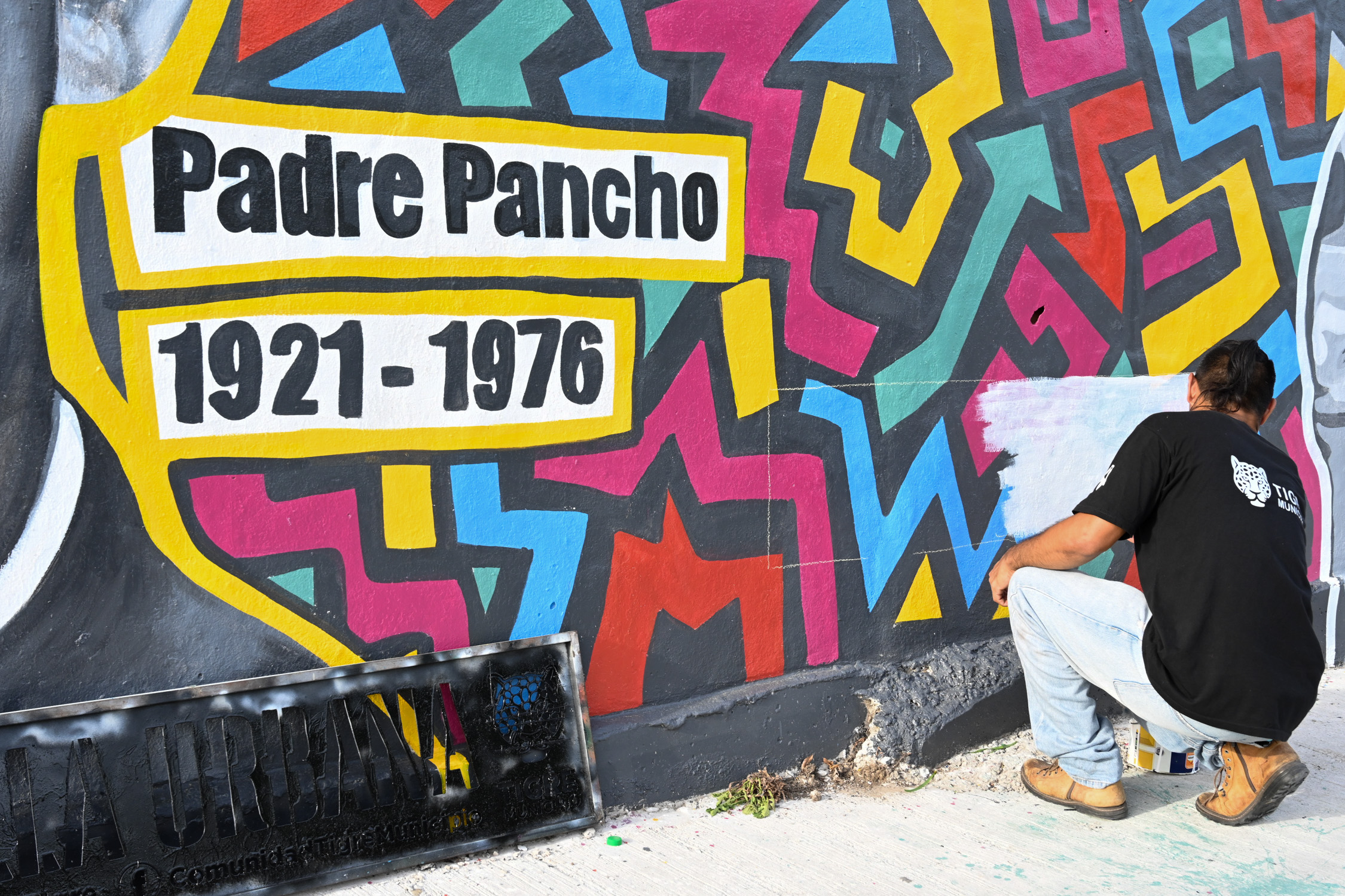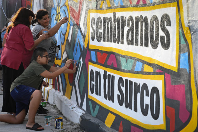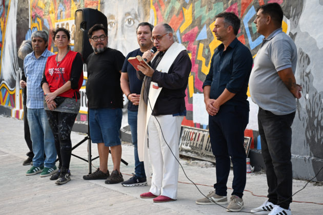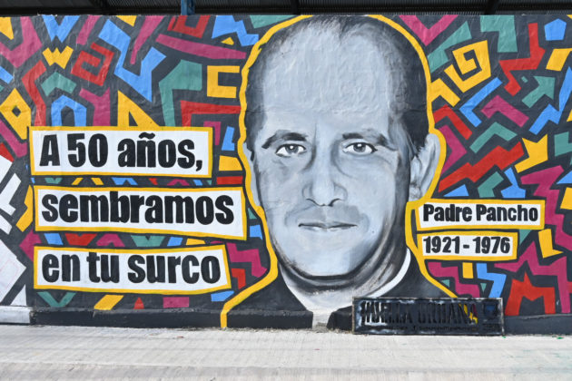 El mural en memoria del Padre “Pancho” Soares fue realizado por la artista Nora Basilio, junto a la comunidad a través del programa Huella Urbana. Al finalizar la obra, brindó sus palabras el Padre Jorge Marenco, el presidente del Club San Roque, Mario Bustos, y Emiliano Mansilla. La obra fue bendecida por el Padre Marenco.