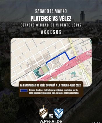 El Ministerio de Seguridad de la provincia de Buenos Aires a través de la Agencia de Prevención de la Violencia en el Deporte -APreViDe- informa que el encuentro entre el Club Atlético Platense y el Club Atlético Vélez Sarsfield el próximo sábado 14 de marzo a las 19:00 horas en el “Estadio Ciudad de Vicente López”, contará con la participación de alrededor de 415 efectivos de la Policía de la Provincia de Buenos Aires, 190 agentes de seguridad privada, 3 ambulancias y bomberos.