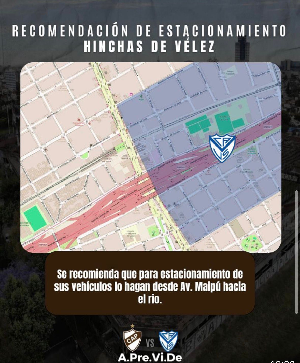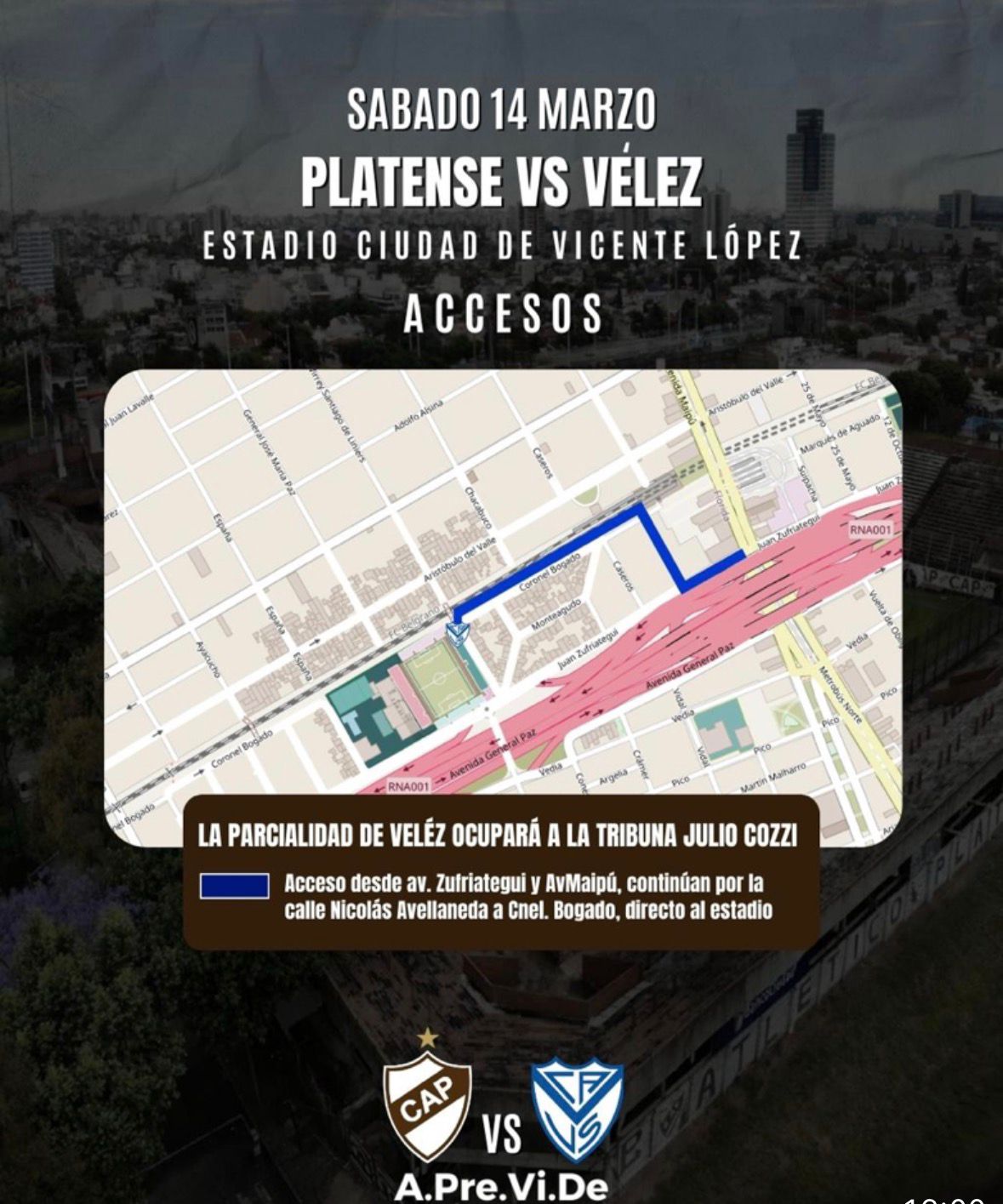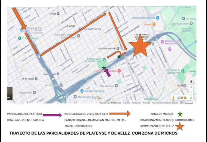 La parcialidad VÉLEZ ocupará a la Tribuna Julio Cozzi con acceso por Puerta “I” desde Av. Maipú y Bogado. Se recomienda llegar al estadio desde Comesaña y Ruta N°7, Acc. Del Oeste (Coto Ciudadela) Cam. Buen Aire tomar Ruta N°9, Autopista Panamericana, bajada San Martín hasta la calle Carlos Francisco Melo, continuar por Av. Maipú hasta Zufriategui, y por calle Bogado al estadio.