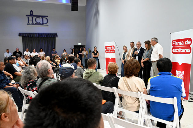 El jefe comunal encabezó el acto en el SUM «Alejandra Nardi», donde vecinos y vecinas de seis localidades del distrito avanzaron en la regularización dominial de sus hogares. La iniciativa, articulada con el Gobierno provincial, busca brindar seguridad jurídica a la comunidad de forma totalmente gratuita.