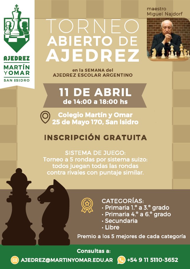 Inscripciones en el link: https://forms.gle/feUTDk37A2onX9xf6 Consultas: ajedrez@martinyomar.edu.ar