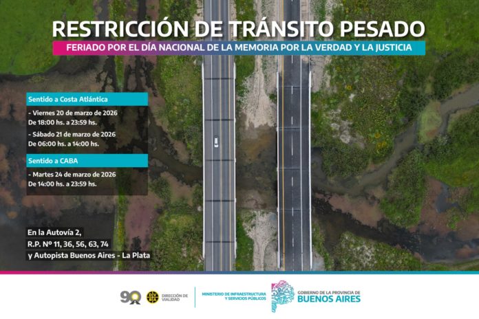 La Dirección de Vialidad de la Provincia de Buenos Aires, dependiente del Ministerio de Infraestructura y Servicios Públicos, comunica que -debido al feriado por el Día Nacional de la Verdad, la Memoria y la Justicia – los días viernes 20, sábado 21 y martes 24 de marzo 2026- se restringirá la circulación de camiones con carga de más de 7 (siete) toneladas de porte bruto en la Autovía 2, las Rutas Provinciales Nº11, Nº36, Nº56, Nº63, Nº74, y la Autopista Buenos Aires–La Plata, con el objetivo de facilitar el desplazamiento vehicular y prevenir siniestros de tránsito en rutas turísticas.