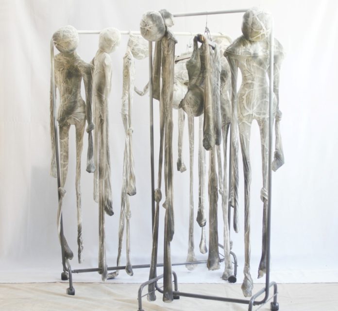 Desde el sábado 21 de marzo, el museo pondrá en diálogo la 29ª edición del Salón de Arte Textil y “Un affaire de colecciones”, una propuesta que reinterpreta su acervo desde la mirada de Patricio Gil Flood.1° Premio Técnica Artesanal, Rosa Arena. Radiografías de los cuerpos, en el final de un largo día en un mundo en caos, 2025. Técnica personal. Medias de nylon, perchas, perchero, pinturas, enduido