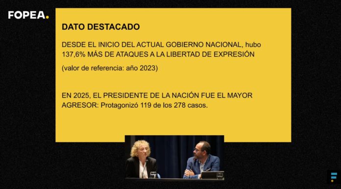 El poder político argentino sigue siendo el principal agresor de la prensa. Según el informe anual del Monitoreo de Libertad de Expresión del Foro de Periodismo Argentino (FOPEA), en el año 2025 se registró un récord de 278 casos de ataques contra periodistas, el más relevante desde el nacimiento del Monitoreo en 2008.